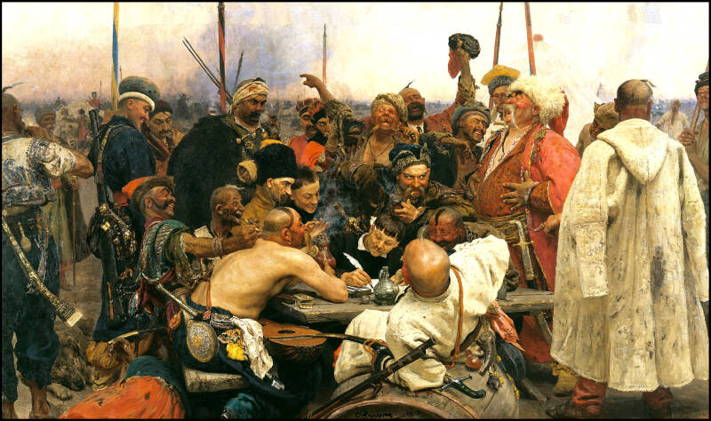 The Zaporozhian Cossacks write a letter to the Turkish sultan. A painting by Ilya Repin (1880-1891) The Cossacks originally had an ethnically mixed composition, although the Slavic component is dominant. They are best known as horsemen in the Russian army. Cossacks often consisted of serfs, impoverished nobles, serfs and other outcasts of society who had nothing left to lose. They left the Russian core area and settled on the fringes of the Russian Empire, such as the Poland-Lithuania border, but mainly in areas that are now part of southern Russia and Ukraine. They formed their own communities here around their village communities, the Stanitsa's. The 'established' Cossacks with their own farms lived mainly from agriculture and cattle breeding. During military expeditions, they did not shy away from robbery.